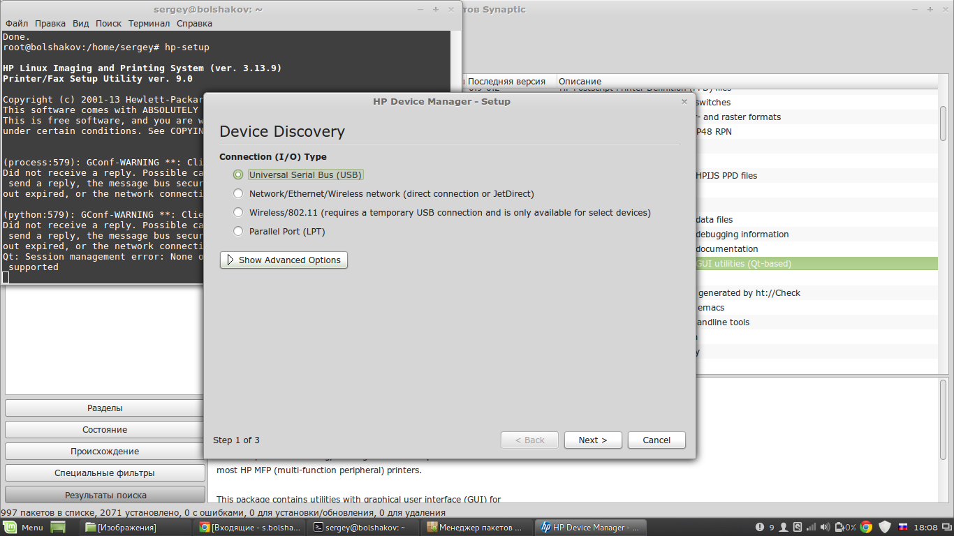 Доустановливаем через тот же Synaptic дополнительный пакет hplip-gui.