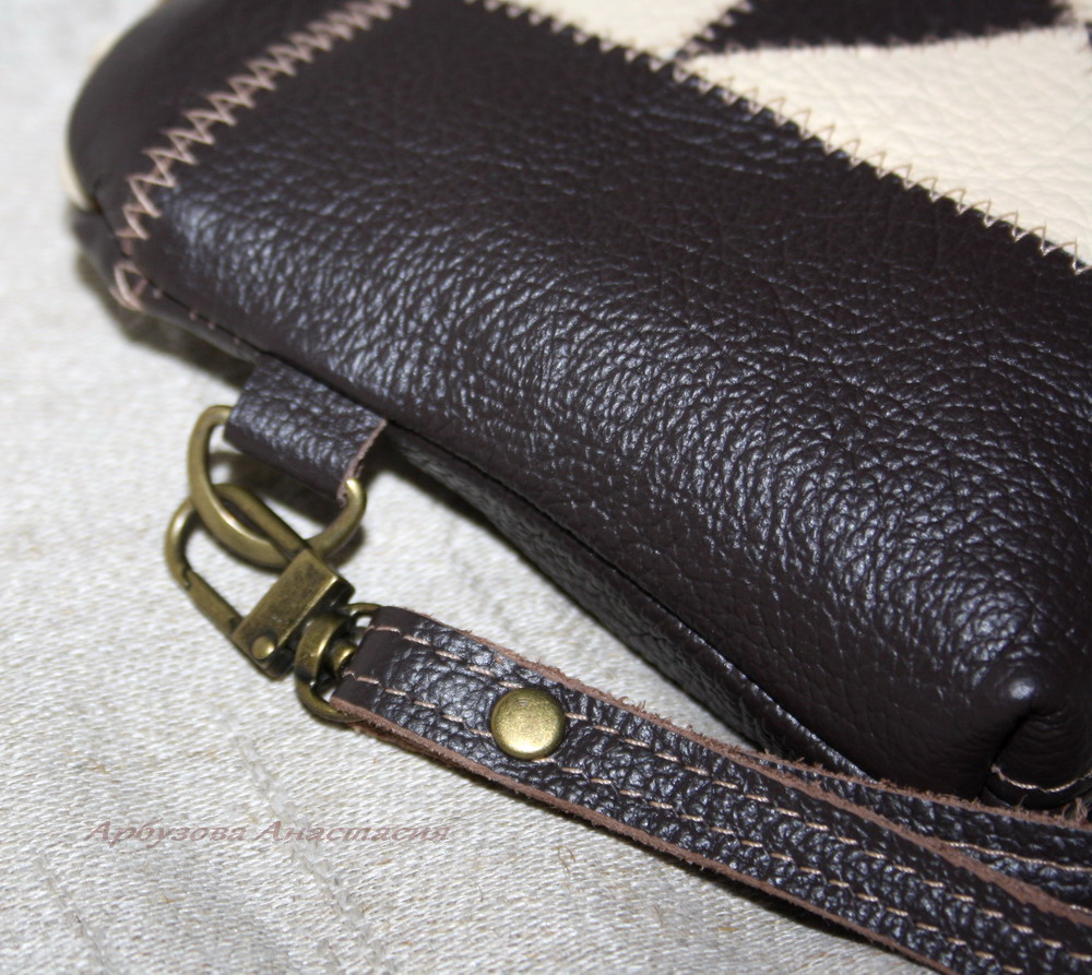 Тело сумочки и ремень — кожа, кант на клапане и кисточка — замша.