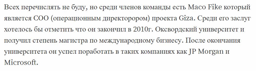 А обзоры проекта до обнаружения скама часто содержали упоминание о сильной команде. Например, этот отрывок из обзора на Голосе: