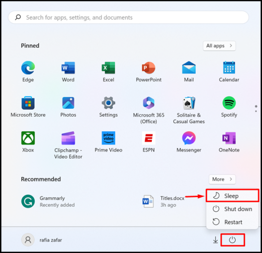 Теперь нажмите клавишу «Окно», нажмите кнопку «Питание» и выберите опцию «Спящий режим», чтобы перевести систему в спящий режим: