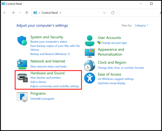 Нажмите на указанную ниже настройку «Оборудование и звук»: