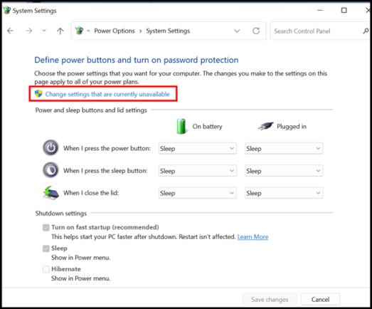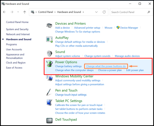 В разделе «Параметры электропитания» нажмите на выделенные ниже настройки, чтобы изменить выбор кнопки питания: