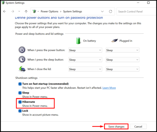 После этого отметьте флажок «Гибернация» и нажмите кнопку «Сохранить изменения», чтобы включить опцию включения режима гибернации: