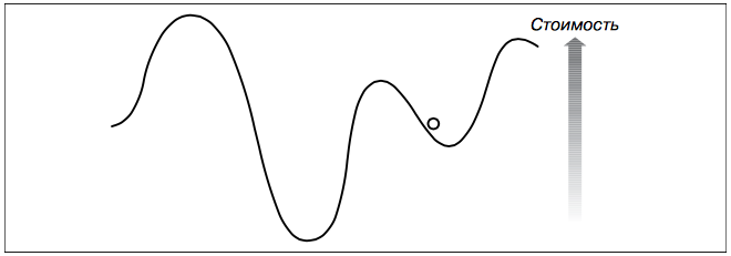 Тут есть важная деталь: если новая стоимость ниже, то новое решение становится текущим, как и в алгоритме спуска с горы. Но, даже если новая стоимость выше, новое решение все равно может стать текущим с некоторой вероятностью. Так мы пытаемся избежать ситуации скатывания в локальный минимум.