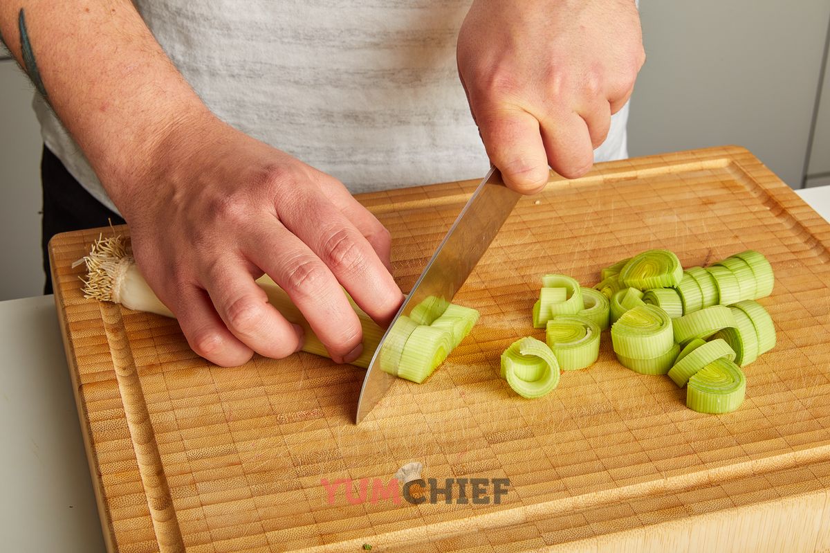 | Слегка взбиваем яйца, добавляем мелко порезаный лук, солим и перчим по вкусу. |
