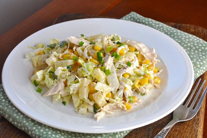 Оригинальный салат с ананасом и копченой курицей, отличается пикантным вкусом с сладковатой фруктовой ноткой.