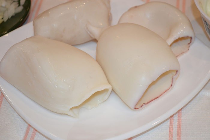 Кальмары отварить (варить в подсоленном кипятке 2 минуты). Важно не переварить, иначе кальмары получатся жесткими. Нарезать охлажденные кальмары соломкой.