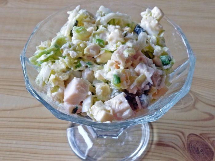 Свежий салат с пекинской капустой, огурцом и варено-копченым мясом. Можно брать свинину или говядину.