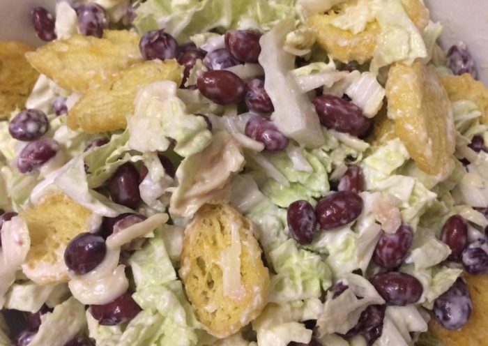 Этот простой салат с сухариками и консервированной фасолью можно приготовить очень быстро. Отличный рецепт для занятых хозяек, которым некогда долго возиться на кухне. Фасоль лучше взять красную, но подойдет и белая, только не в томатной заливке, а натуральная.