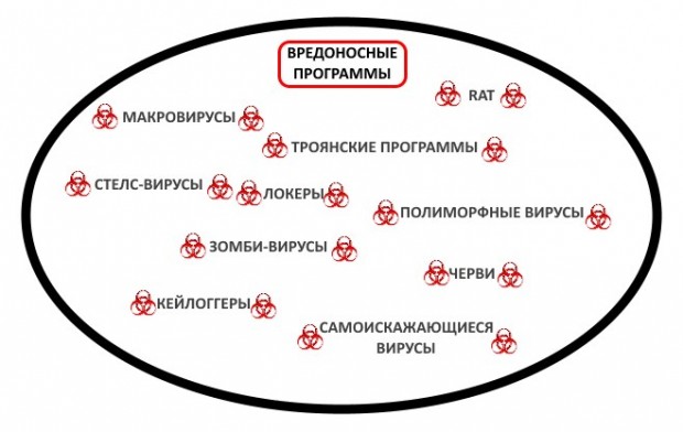 Следующим пунктом в нашем топе угроз идут вредоносные программы. Под понятие вредоносной программы подпадают все программы, которые написаны со злым умыслом. Все виды вредоносов мы рассматривать не будем, только основные, которым стоит придавать особое значение.