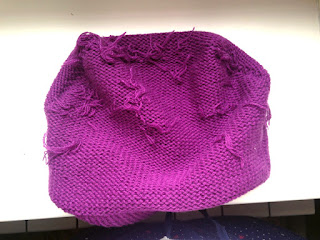 да-да 😉 Бедная ниточка дошла до своей судьбы за три трудных года скитаний и лишений. Она не пристроилась ни в детские вещи, ни в жаккард, попыталась было пойти узкими полосками в свитер, а он оказался неудачным и был распущен, так что она стала смотана в 4 сложения и порезана на кусочки длиной примерно два метра. Остаток, сидящий на бобинке, погрызла моль. Однако упрямая я моль вывела, свитер с его маленькими кусочками распустила и таки дождалась сиреневого вдохновения! Для соединения я надрезала ниточки (все 4) до разной длины с шагом 3см и связывала поштучно короткие хвосты с длинными. Сто раз, не меньше! И надгрызы моли тоже. На эти соединения у меня ушло времени наверное больше, чем на само вязание, зато все получилось аккуратно, и, ха-ха, с лица это выглядит ровной, как рассветное озеро, лицевой гладью.