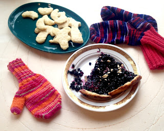 Тут все мои страсти 😉 Плохая композиция, свежие носочки, пока еще одна новая варежка и свежайшие плюшки — печенье мы с Олькой пекли вчера чуть ли не ночью, она очень любит это дело и уже отлично справляется. А пирог с черникой и кешью (миндаля не нашлось) — уже утром, перед работой. Круто, а? Кстати о любви — коллеги от пирогов уже стонут. То я, то коллега приносим какое-то изделие и всех угощаем. Диеты и их любители страдают ужасно! Но едят ;-))) А Олька вот пироги почти не ест, только если краешки погрызть. Удивительный ребенок не любит никакие начинки, так что по размышлении мы половину теста пустили в печенье, а вторую половину уже в пирог. И деточка поела, и развлеклась, и в начинку можно класть что хочу без страха аллергии.
