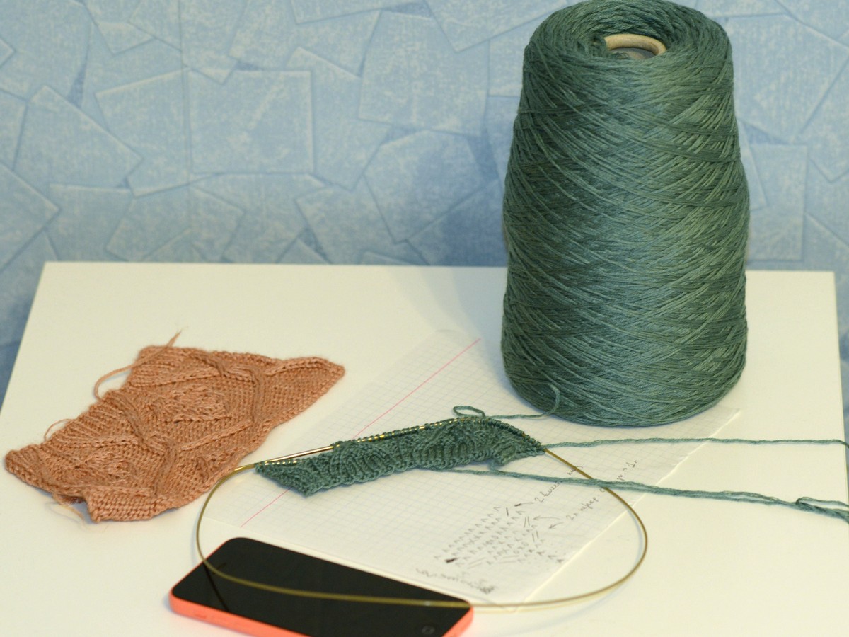 У кофточки с листиками закончилась сложная кокетка, а я перешла на спицы 2.25мм, типа толстые, и как ломанулась в лицевую гладь! Сразу стало вязаться очень приятно, быстро, и нитка уже стала ощущаться как имеющая толщину и весомость (раньше мне казалось, что этих качеств у нее нет, и неудивительно — 600м/100г и смотана она из 5 тончайших ниточек). А так даже с удовольствием, ровненько так, упруго. И гладь отлично пошла для отдыха от сложностей. Еще выпало несколько вязальных дней, и я сама не верю глазам — уж не только кокетка, тушка уже заканчивается! А я все никак не могу рассчитать, сколько же сантиметров я хочу вязать до резинки, хм. Это непорядок, надо хоть сантиметр в руки взять. Плохо то, что по моему образцу отлично мерялась горизонтальная плотность, но очень плохо мерялась вертикальная — терпения не хватило столько навязать, так что по вертикали она у меня на глаз и с прикидкой, что наверное после стирки немного подсядет, поэтому цифры опять будут по шкале “пальцем в небо” и “авось удачно”.