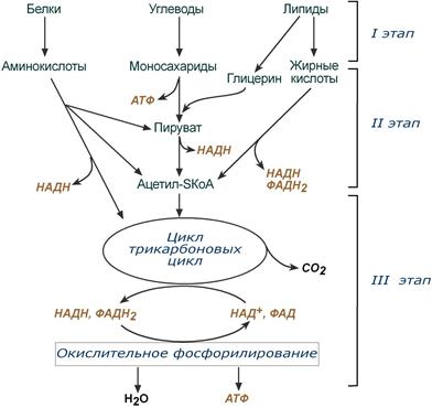 - Кислородный этап – дыхание клетки. Начинается циклом трикарбоновых кислот, когда атомы углерода покидают органические вещества, соединяются с кислородом и образуют углекислый газ. Затем в митохондриях клеток завершается распад нутриентов – образуются молекулы АФТ и вода.