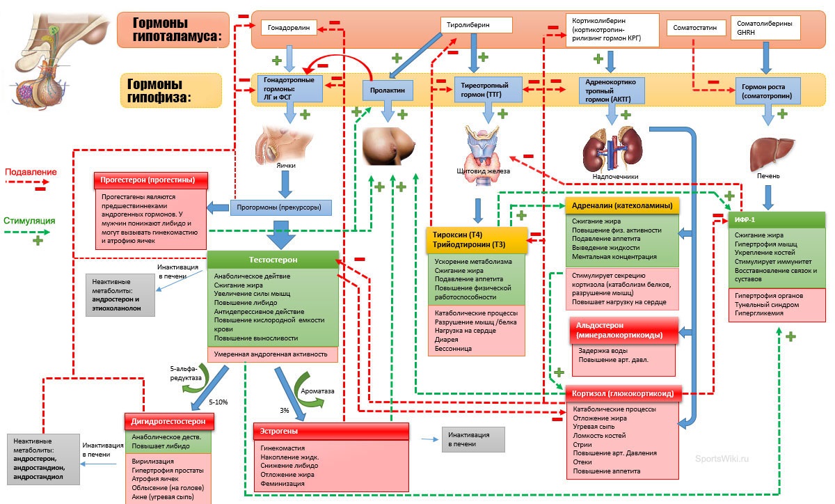Метаболизм представляет собой совокупность огромного количества химических реакций, баланс между ними поддерживается гормонами. Получив сигнал о возникшей потребности, центры мозга – гипоталамус и гипофиз – мобилизуют эндокринную систему (надпочечники, щитовидную железу, яички и яичники, печень) на выброс гормонов в кровь. Одни из них стимулируют синтез и рост тканей. Другие блокируют анаболические процессы, запускают катаболизм – превращение вещества в энергию.