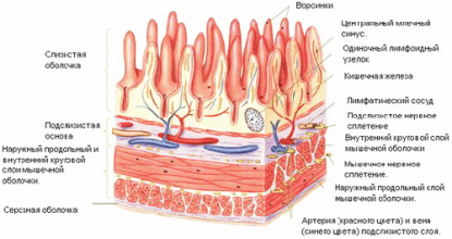 Полностью перевариваются все углеводы, жиры и части белков в тощей и подвздошной отделах кишки под действием ферментов, вырабатывающихся на месте. Слизистая кишечника усыпана ворсинками – энтероцитами. Именно они всасывают продукты переработки белков и углеводов, которые поступают в кровь, а жировые элементы – в лимфу. Вследствие большой площади стенок кишечника и многочисленных ворсинок, поверхность всасывания составляет приблизительно 500 квадратных метров.