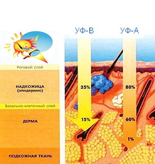 УФА лучи на самом деле более коварны они не вызывают покраснений и ожогов но именно их обвиняют в необратимом (в том числе и канцерогенном) воздействии на кожу. Эти лучи повреждают молекулы ДНК и нарушают её синтез, вызывают аллергические процессы ( фотоаллергия и фототоксичность)
