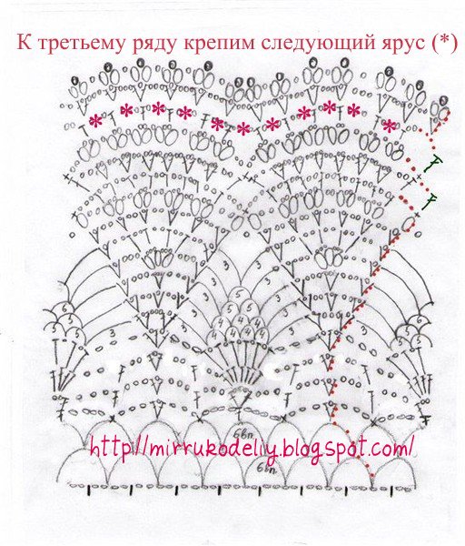 2. В первом ярусе «выбросила» из схемы по одному мотиву «ананаса» для проймы. Это хорошо видно на фото №5. Сделано это для удобной посадки лифа.Верхний ярус из 12 мотивов (6 перед и 6 спинка).