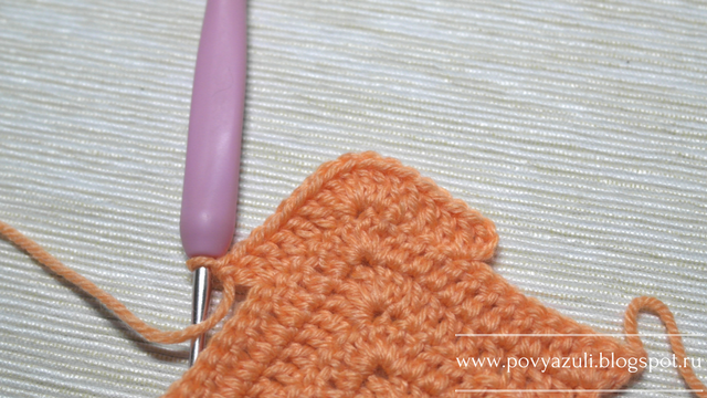 3 шаг: поверните вязание, наберите 3 вп для подъема, 1 с1н в те же петлю, откуда выходит цепочка из 3 вп. Далее 1 с1н*6. В центральную верхушку с1н предыдущего ряда провяжите сразу 5 с1н. Далее 1 с1н*6. В 3-ю петлю цепочки из 3 вп с краю провяжите 2 с1н. Должна получиться треугольная форма детали. В этом ряду получается 21 с1н.