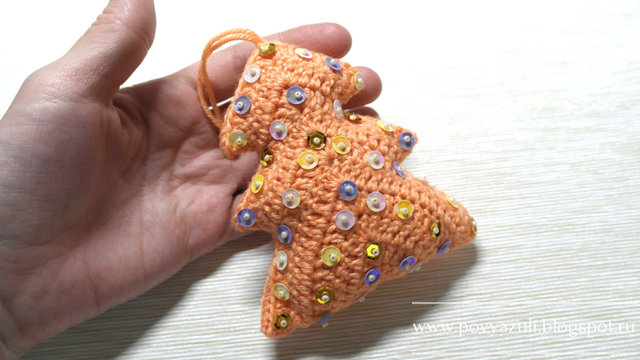 11 шаг: свяжите вторую деталь для елочки. На второй части оставьте длинный кончик нити, чтобы с ее помощью соединить две детали по краю, сшив их. До сшивания двух деталей, первую деталь елочки украсьте пайетками с бисером.