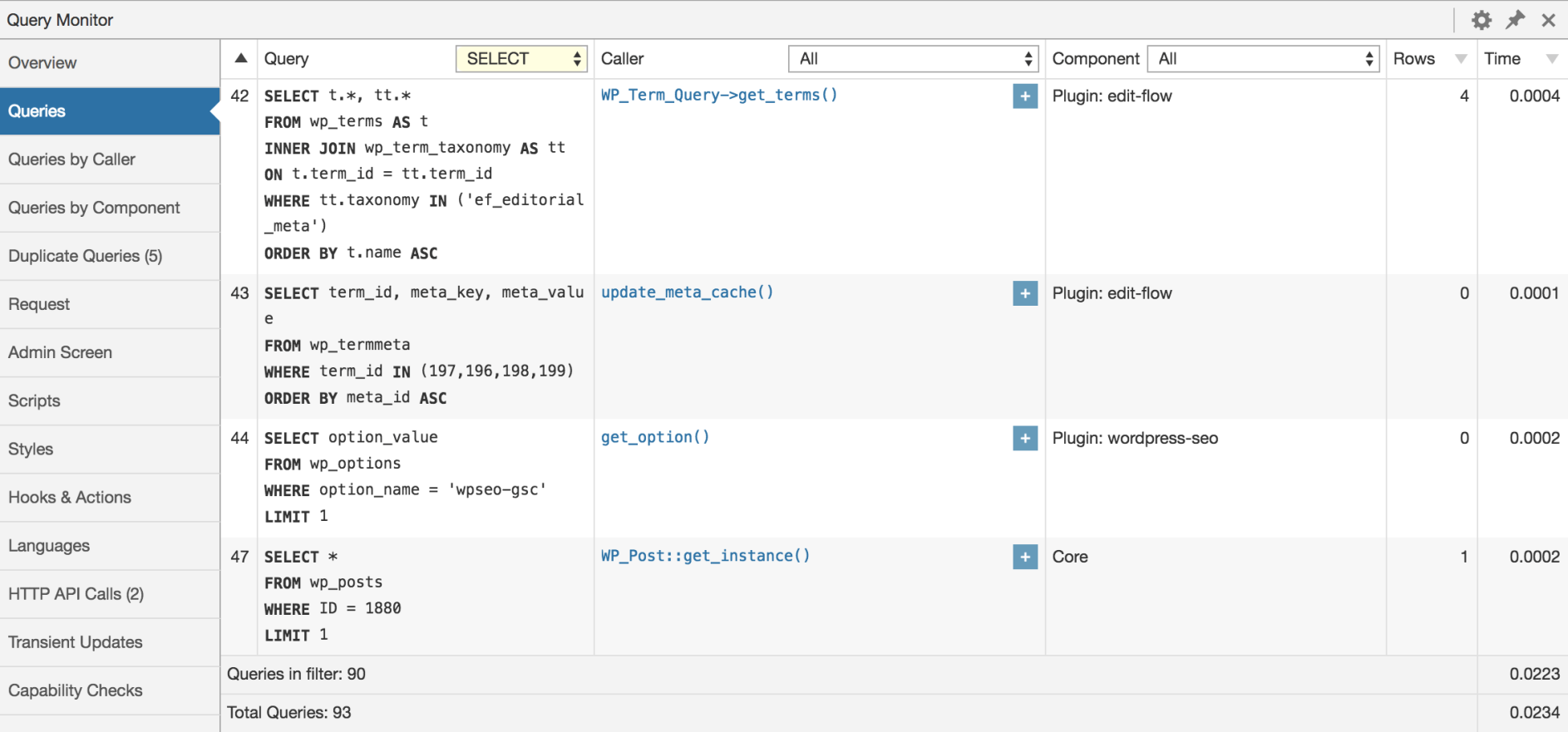 Кроме того, слишком большое количество запросов в конечном итоге увеличивает время загрузки. Следовательно, вы должны использовать диагностический инструмент для мониторинга всех ваших запросов к базе данных. Query Monitor — один из лучших примеров такого инструмента. Бесплатный инструмент помогает отлаживать ошибки PHP, запросы, таблицы стилей и скрипты.