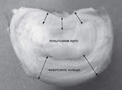 Межпозвоночный диск устроен в виде конфеты Меллер: снаружи плотная оболочка (фиброзное кольцо), которая удерживает в себе упругое ядро (пульпозное ядро).