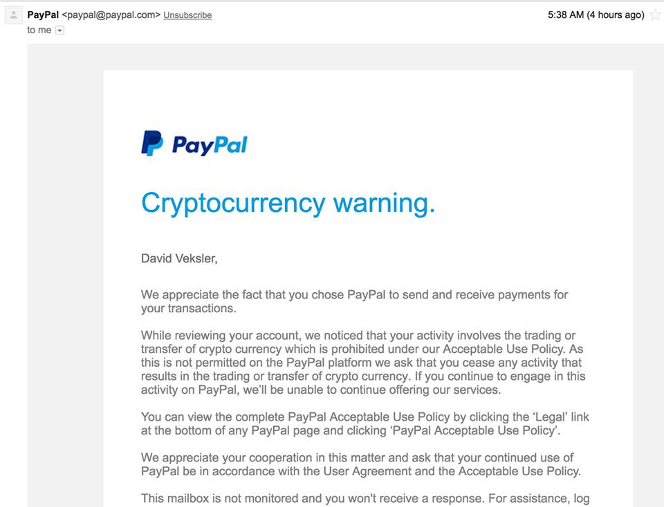 «Во время проверки вашего аккаунта мы заметили, что ваша деятельность включает торговлю или передачу криптовалют, что запрещено нашей Политикой допустимого использования. Поскольку такая деятельность запрещена на платформе PayPal, мы просим вас прекратить любую деятельность, которая сводится к торговле или передаче криптовалюты. Если вы продолжите заниматься этим на PayPal, мы будем вынуждены отказать вам в предоставлении наших услуг».