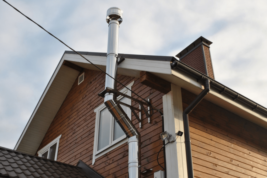 Для каркасных домов заднее подключение не используется. Дымовая труба ставится сверху. При этом важное внимание уделяется противопожарным мероприятиям при прохождении межэтажных, чердачных перекрытий, кровли. Обязательно утепляют участок трубы, проходящий по чердачному помещению, если оно неотапливаемое.