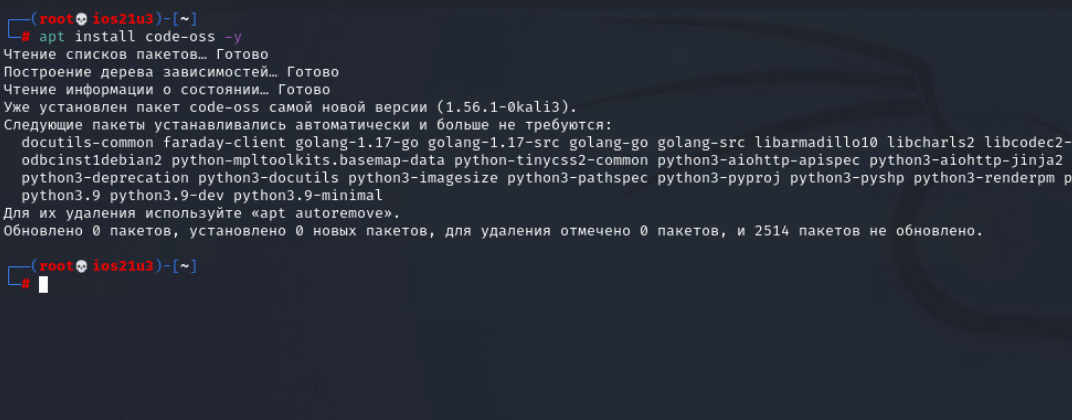 Нам нужно выполнить одну единственную команду “sudo apt install code-oss”, чтобы установить VSCode на нашу систему Kali Linux.