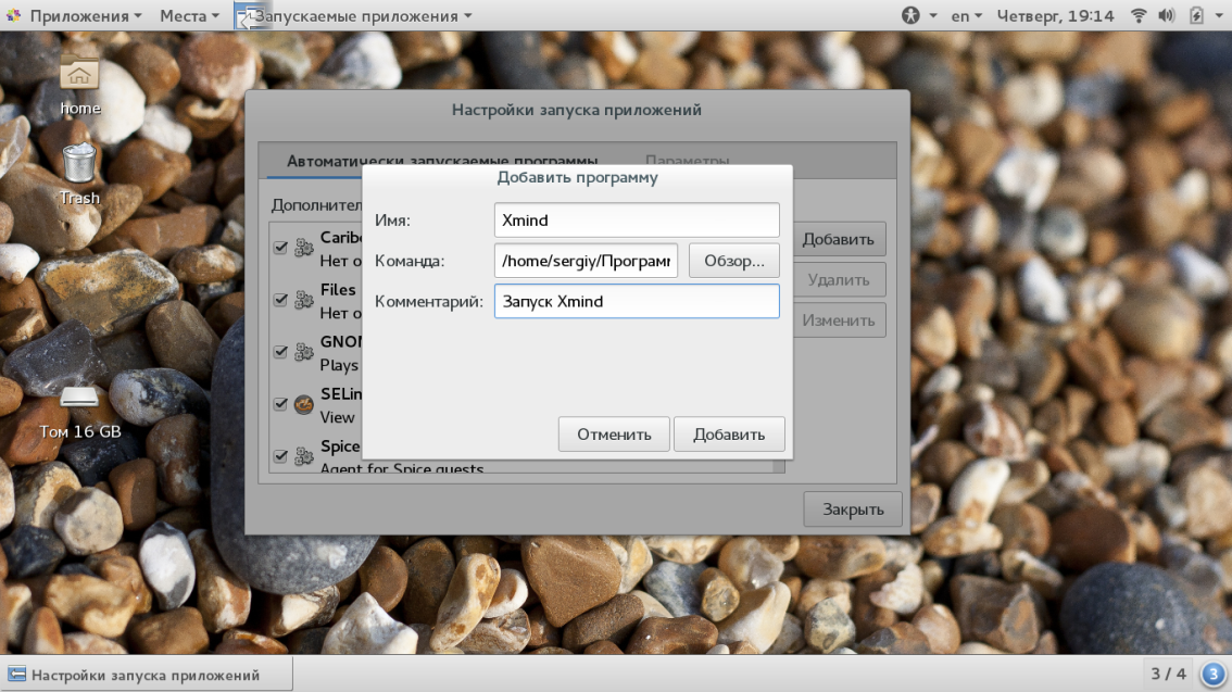 Готово. Осталось сохранить изменения. При следующем запуске X сервера сработает автозапуск Linux и выполняется эта команда. Таким же способом может выполняться автозапуск приложений linux.