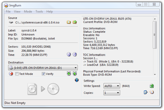 Прежде чем делать что-либо еще, вам нужно скачать копию компакт-диска System Rescue и записать образ ISO на диск. Для этой задачи я предпочитаю простую утилиту ImgBurn, но вы можете использовать вместо нее любое приложение для записи.