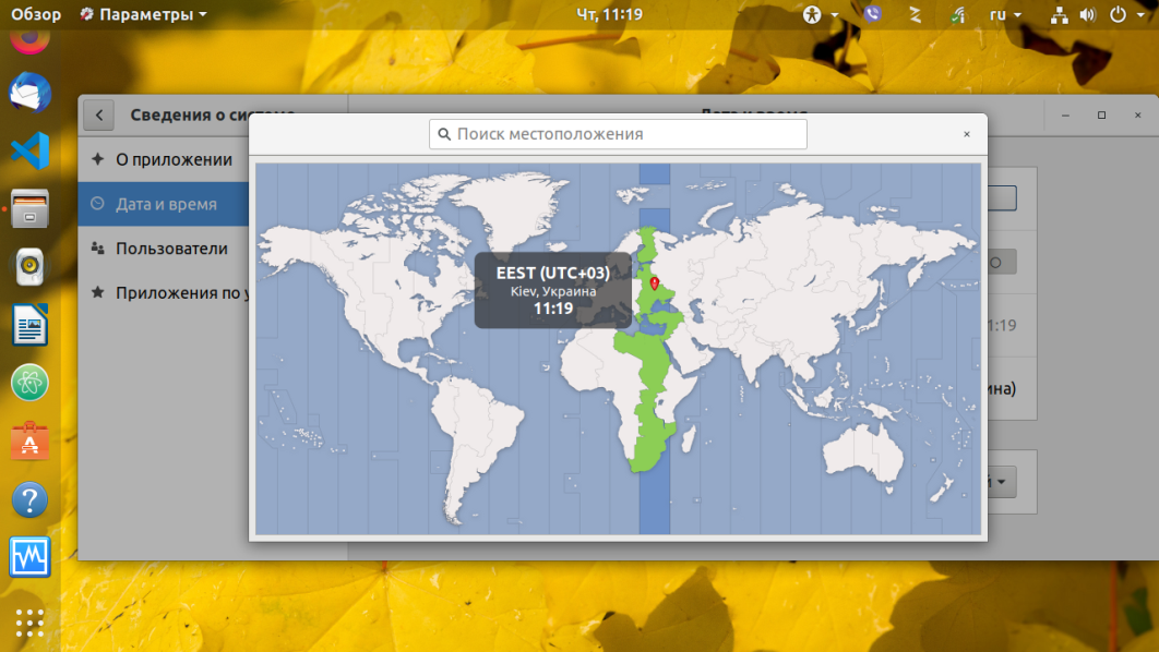 В дистрибутиве Ubuntu и других, использующих Gnome, настройка часового пояса Linux может быть выполнена прямо в параметрах системы. Для этого выберите пункт Сведения о системе, затем Дата и время, выберите свое местоположение на карте, или наберите название для поиска в поле ввода: