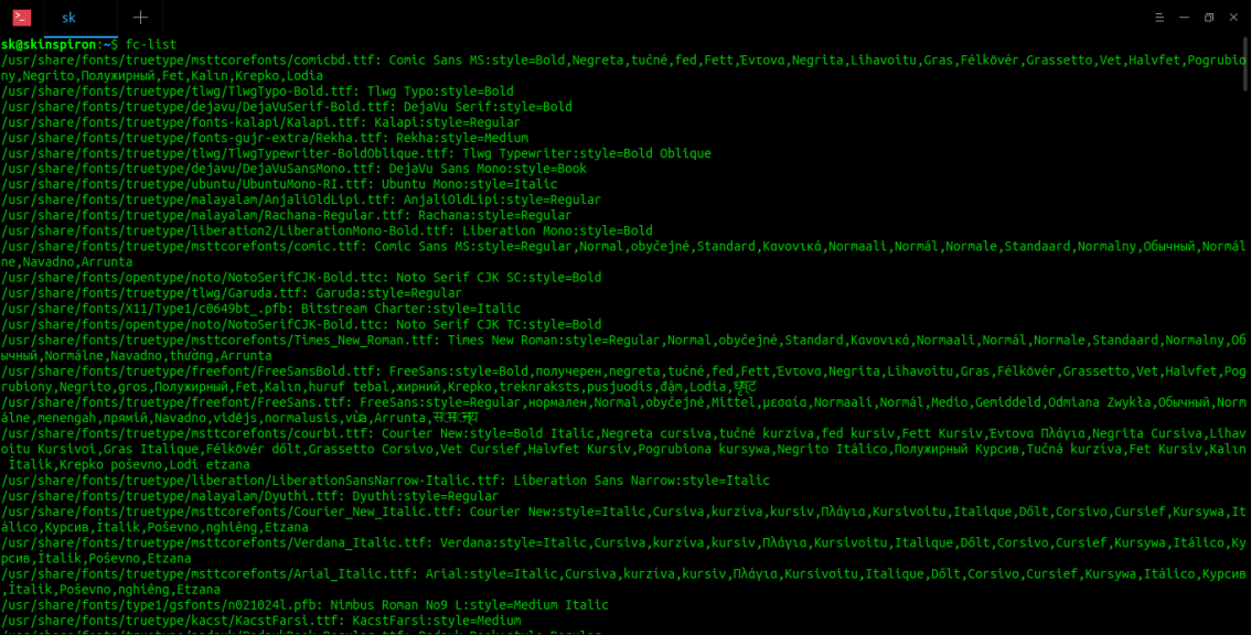 Примечание. Если fc-list не найден в вашей системе, установите пакет fontconfig. Например, чтобы установить fontconfig в Ubuntu и его производных, запустите: