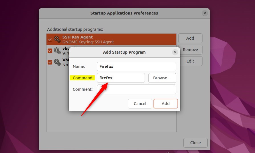 Когда откроется Startup Applications, нажмите «Добавить» и введите команду, которая будет выполняться при входе в систему (имя и комментарий необязательны).