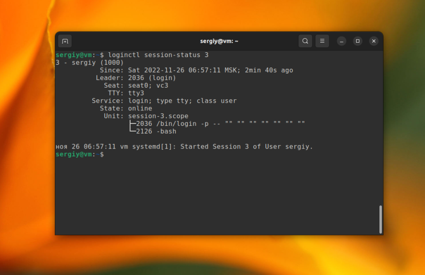Мы рассмотрели как пользоваться loginctl для просмотра информации о сессиях и авторизованных пользователях, а также как завершать сессии пользователей. Как видите утилита довольно проста в использовании и позволяет сделать всё в одном месте.