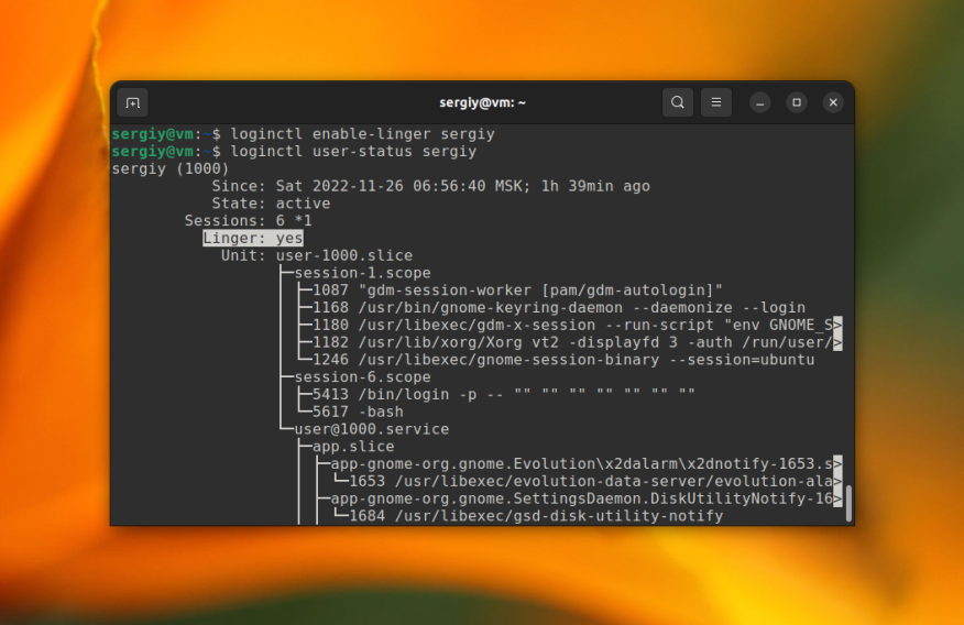В Systemd есть поддержка сервисов, запускаемых от имени пользователя. Этими сервисами можно управлять без использования sudo и это довольно удобно. Окружения рабочего стола, например, Gnome уже давно используют эту возможность. Это такие сервисы, для управления которыми используется команда systemctl с опцией —user. Обычно, такие сервисы запускаются когда пользователь авторизуется в системе и останавливаются при выходе. Но иногда возникает необходимость сделать так, чтобы процессы пользователя запускались при загрузке системы, до его авторизации и не завершались с завершением сессии. Вы можете настроить это с помощью loginctl.