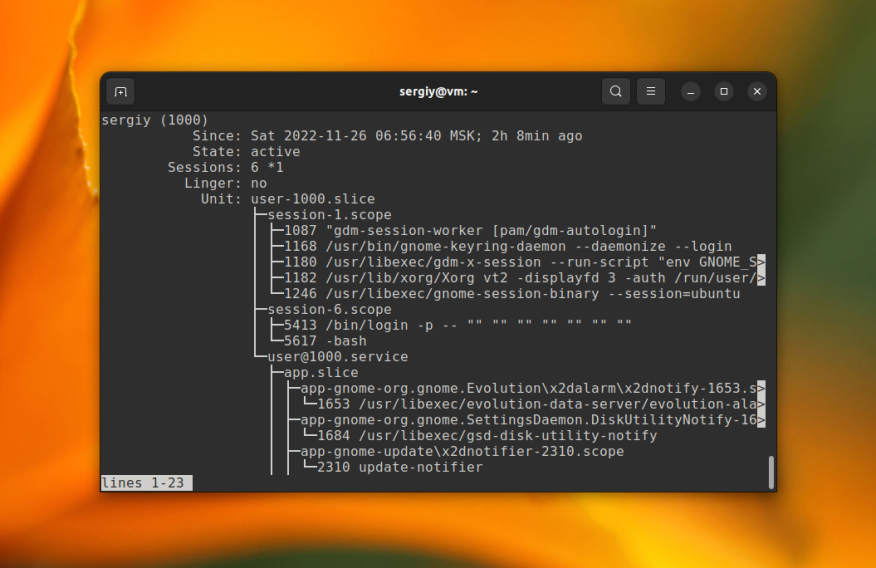 В поле Sessions выводятся идентификаторы всех сессий пользователя, причём активная сессия будет отмечена звездочкой. Ниже выводятся Systemd сервисы запущенные от имени этого пользователя и запущенные ими процессы. По умолчанию список процессов может быть сокращён. Если вы хотите видеть все процессы используйте опцию -l или —full: