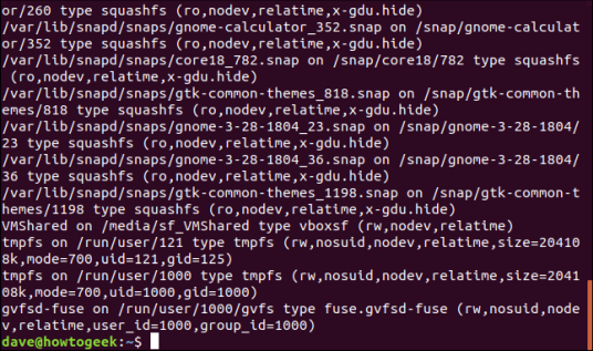 В Mount есть множество опций, но для вывода списка всех смонтированных файловых систем на вашем компьютере вообще не требуется никаких опций. Просто введите mount и нажмите Enter: