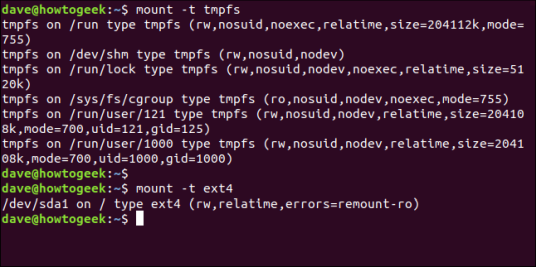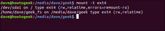 Если мы используем mount для вывода списка смонтированных файловых систем, но ограничиваем его вывод файловыми системами ext4 с помощью параметра -t (type), мы ‘ Посмотрим, что теперь есть две смонтированные файловые системы ext4 .