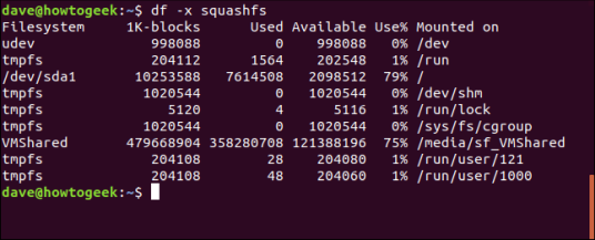 df , используемый без параметров, дает ту же проблему перегрузки информацией, что и mount . Например, в Ubuntu Linux существует псевдофайловая система squashfs , созданная для каждого приложения, которое было установлено с помощью команды snap . Кто хочет увидеть все это?
