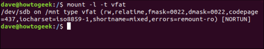Мы используем параметр -t (тип), чтобы запросить mount сообщать только о файловых системах vfat .