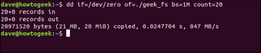 dd if =/dev/zero of./geek_fs bs = 1M count = 20