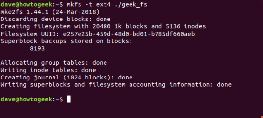 Мы можем создать работающую файловую систему внутри файла geek_fs , используя команду mkfs . Параметр -t (тип) позволяет нам выбрать файловую систему тип . Мы создаем систему ext4 .