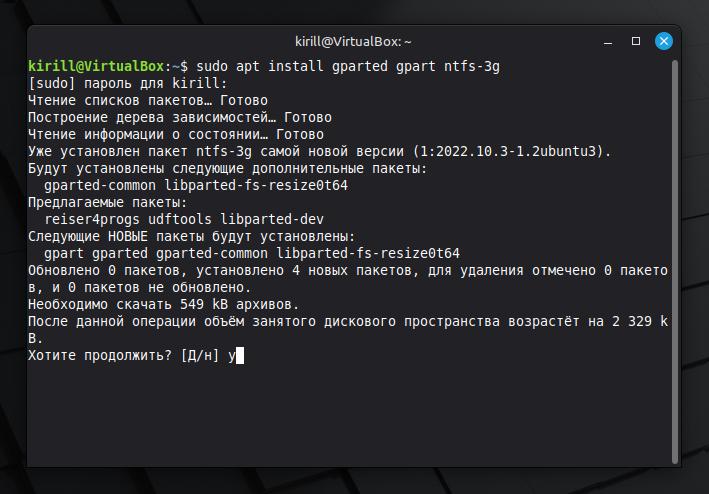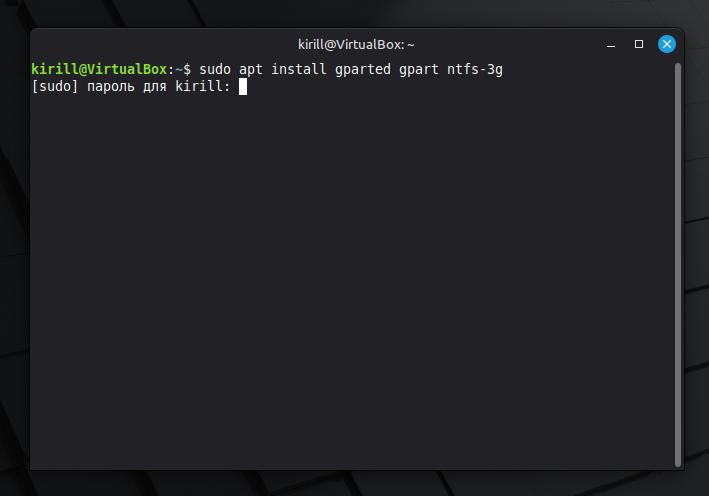 sudo apt install gparted gpart ntfs-3gВводим пароль администратора. Нажимаем Enter.