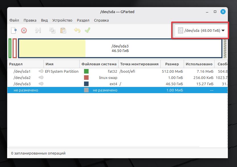 Открываем программу GParted. Выбираем нашу флешку в правом углу программы.