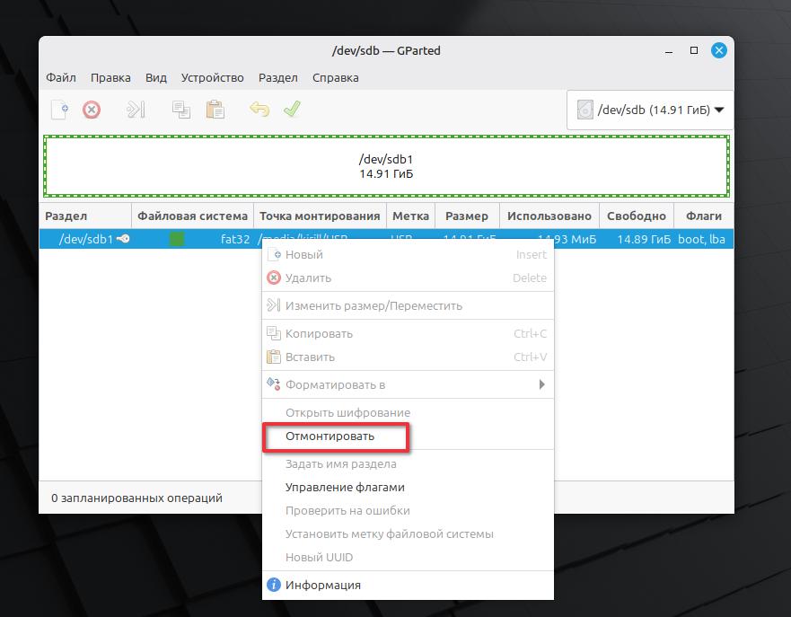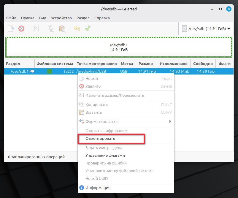 Нажимаем правой кнопкой мыши по разделу dev/sdb1. В контекстном меню выбираем Отмонтировать или может быть написано Размонтировать.