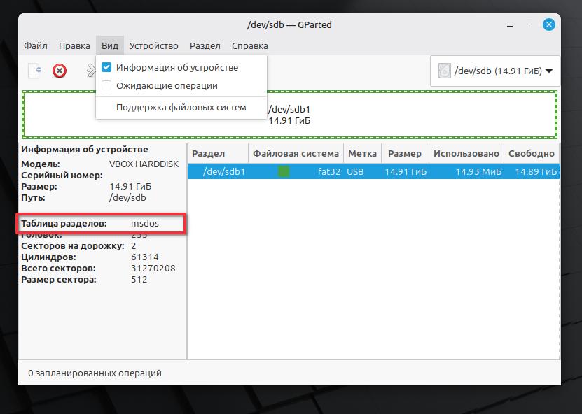 Посмотрим какая таблица разделов у нас на флешке. В верхнем меню программы GParted выбираем Вид > Информация об устройстве.