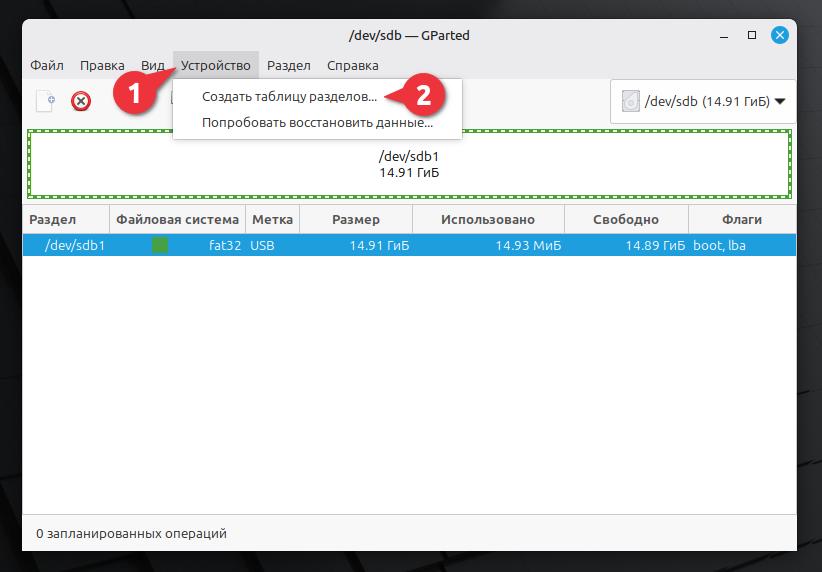Как видите, у нас таблица разделов msdos (MBR). Нам это не подходит, создаём таблицу разделов GPT. В верхнем меню программы GParted выбираем Устройство > Создать таблицу разделов.