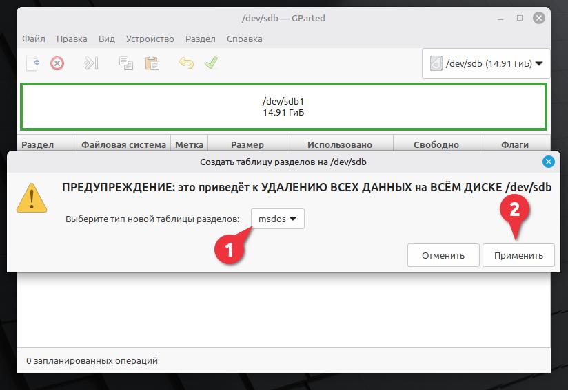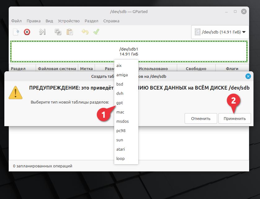 Выбираем в списке тип новой таблицы разделов gpt, после этого, нажимаем Применить. Также, нас предупреждают, что все данные будут удалены. Если у Вас есть на флешке важные данные, сохраните их на другой диск.
