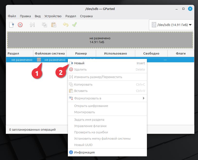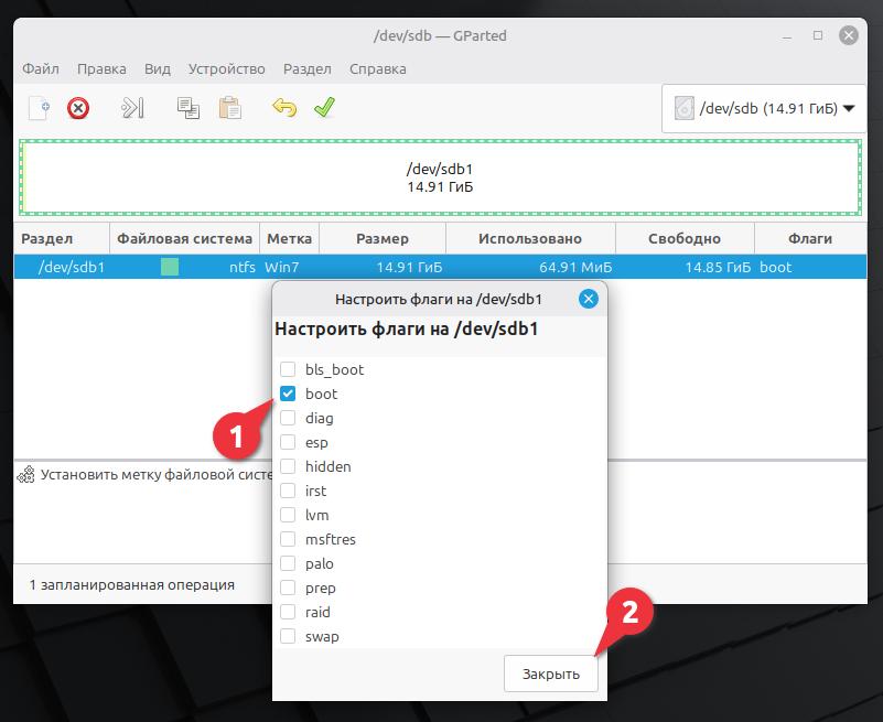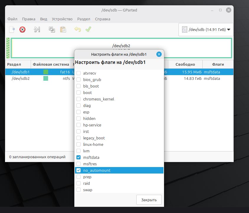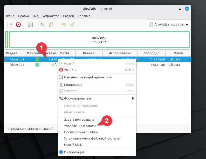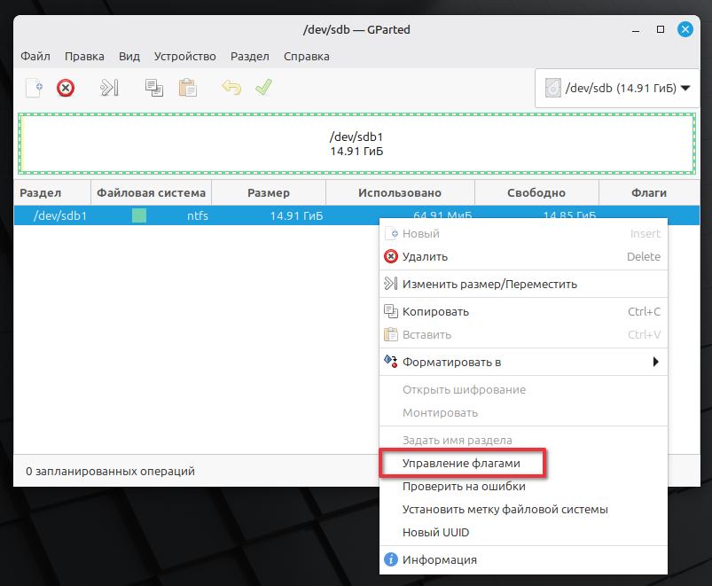 Нажимаем правой кнопкой мыши по разделу dev/sdb1. В контекстном меню выбираем Управление флагами.